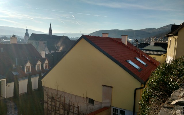 Den fast weihnachtlichen Spaziergang durch Krems an der Donau, bei angenehmen 15 Grad, startete ich bei der Kreuzung Wegscheid/Untere Landstrasse. Das 1. Ziel war der Pulverturm, von dort hat man einen schönen Blick über das Kremstal Richtung Osten. Mit etwas Glück sieht man einen Hubschrauber am KH Krems starten oder landen.