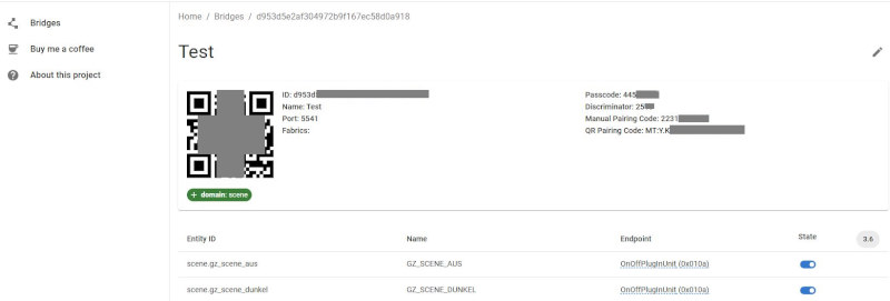 ich habe den Home-Assistant-Matter-Hub auf Port 5540 laufen, die Instanz mit Port 5541 hab ich nur für den Blog-Eintrag angelegt. Fabrics hat bei mir bei der neu hinzugefügten den Wert 0, wenn es mit etwas gekoppelt ist, dann ist es 1. Bei der gekoppelten Bridge, sieht man dann unterhalb von Fabrics das Amazon Logo. (Detailansicht)